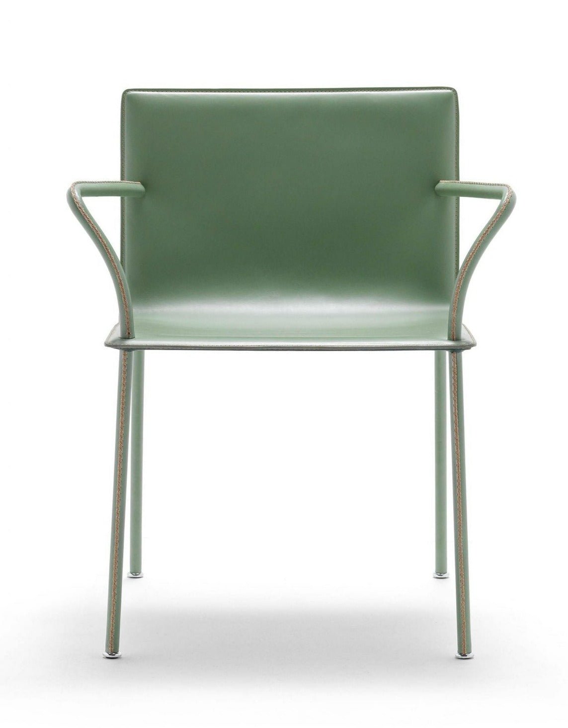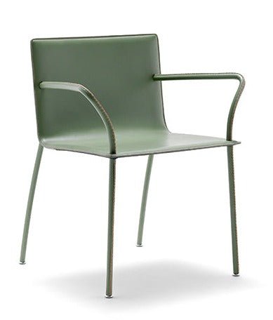 Lys P by Fasem is a dining armchair with a steel frame completely covered in Fasem’s full-grain hide leather or premium soft leather, with contrast stitching. The Lys P works great as a contemporary dining chair and is also suitable for office use in the waiting room or as an office visitor chair. The craftsmanship is evident in the hand-finishing, cutting, and stitching of the whole upholstery, from the seat to the armrests and the legs.